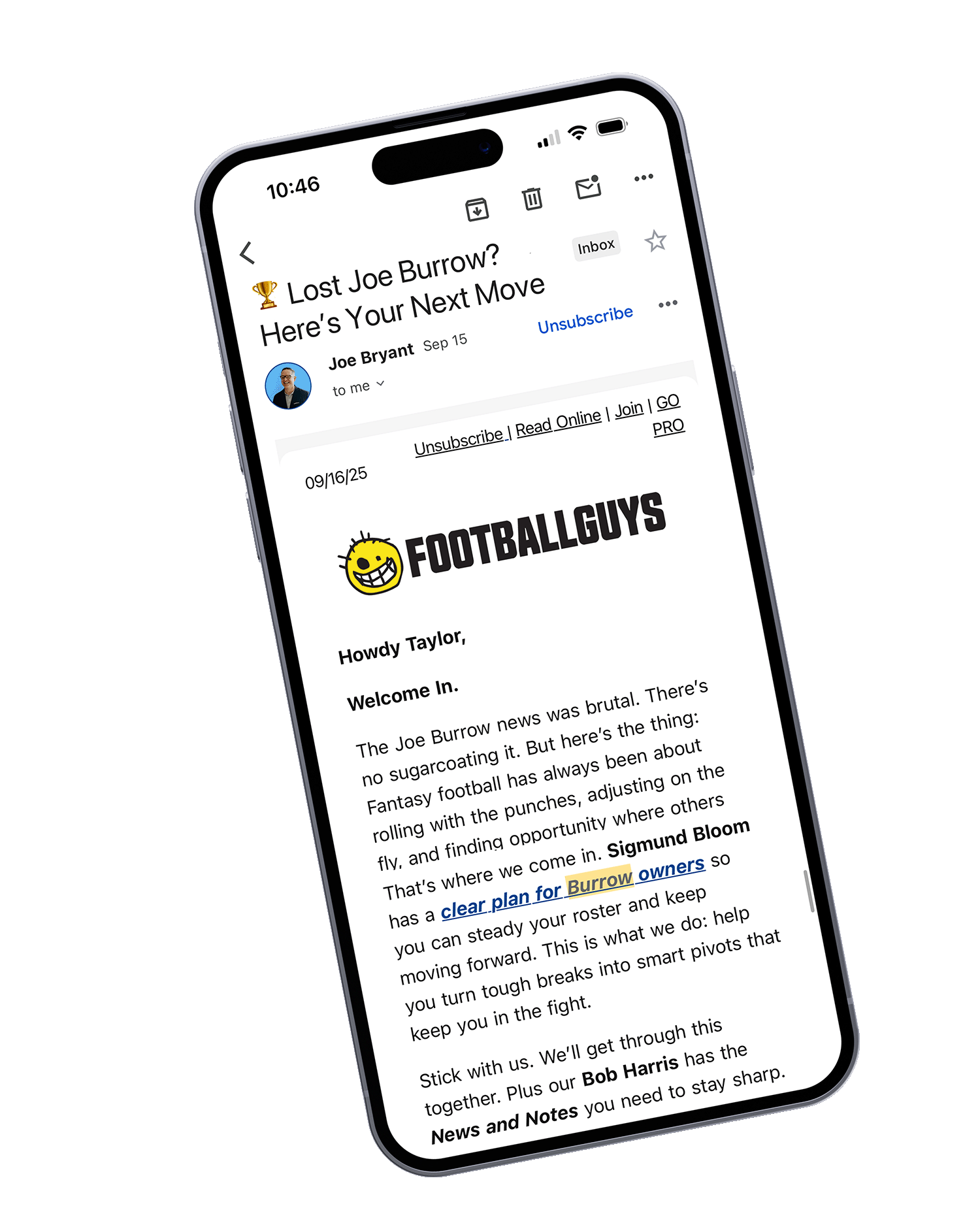 Buckle Up. Your Fantasy Football Season is about to change. For the better.The Footballguys Daily Update: Every morning, For over 20 years we've spent our days scouring the corners of the internet, gathering every bit of relevant fantasy football news. We then summarize it for you in one easy to read email, and provide actionable analysis on what it means for your Fantasy League.The Daily Update should hit your inbox in the early morning every day from the NFL Draft until the Super Bowl. And twice a week in the offseason. If you want to get a feel for what to expect you can check out previous updates HERE.